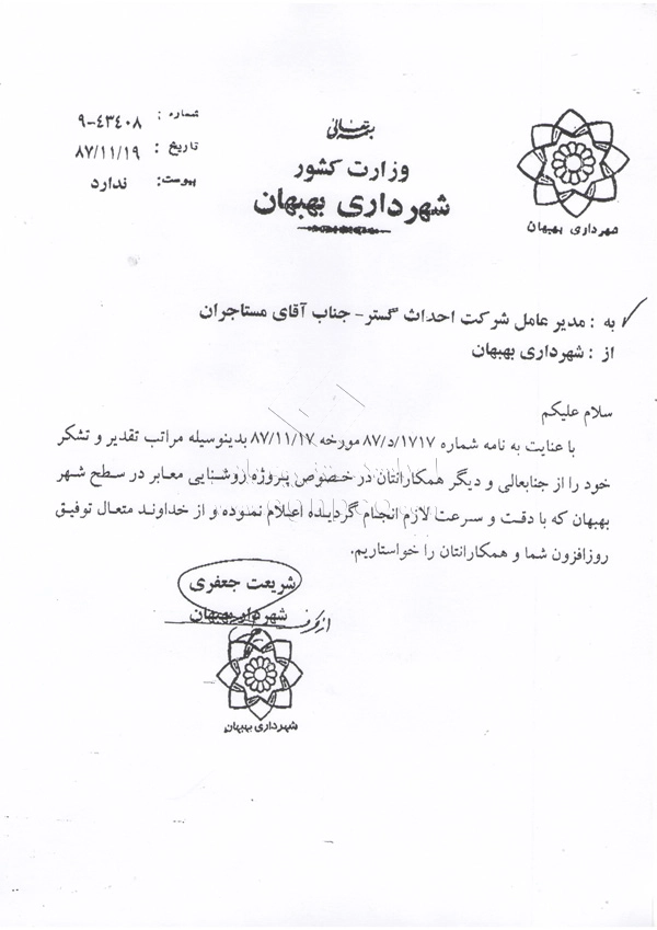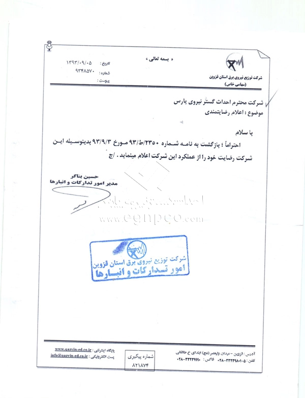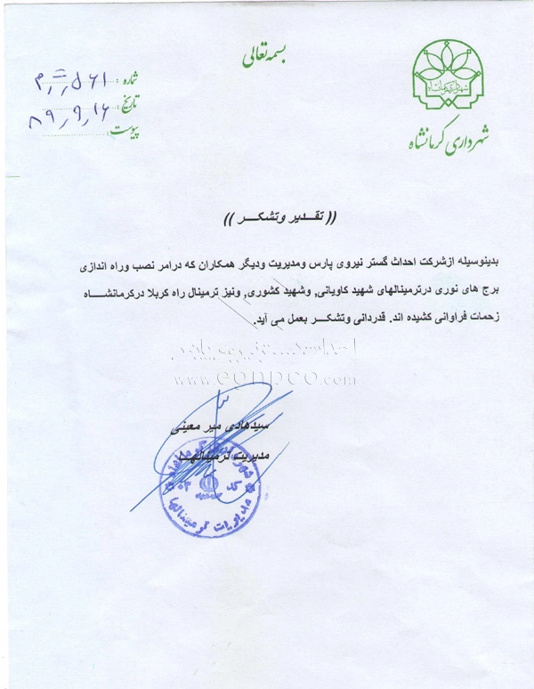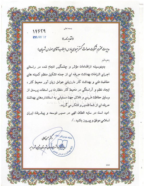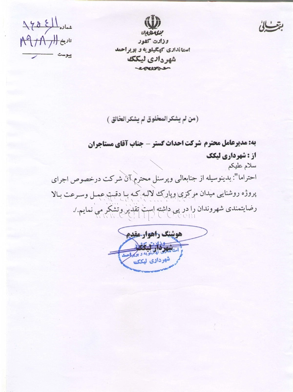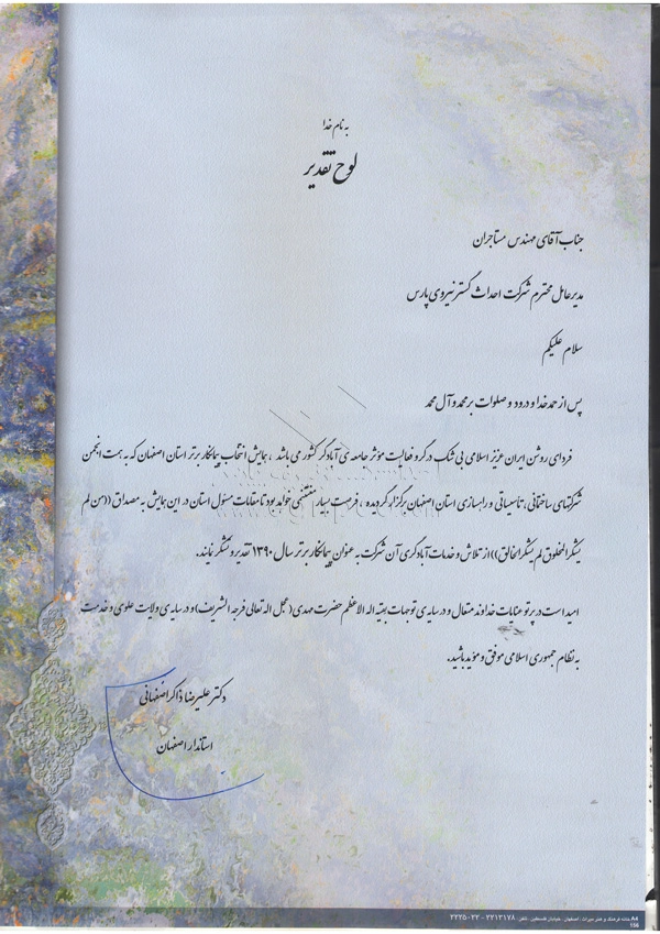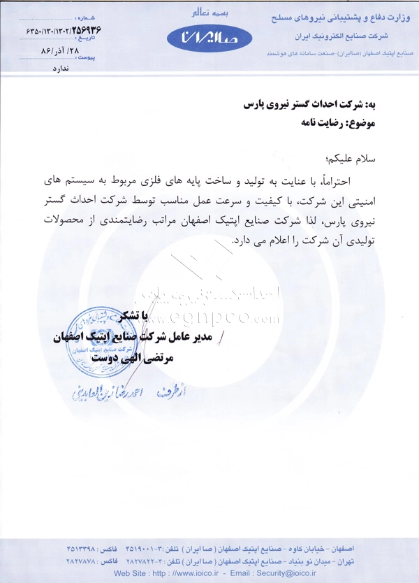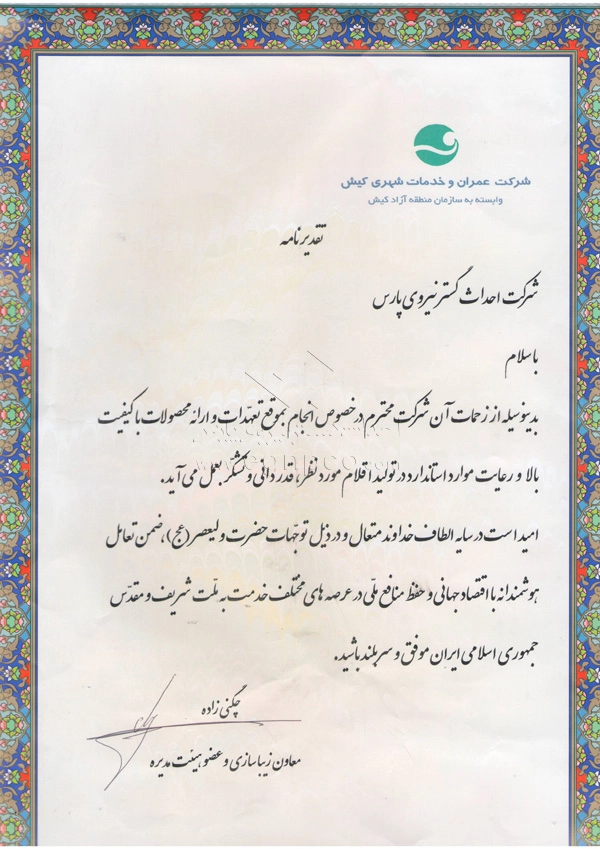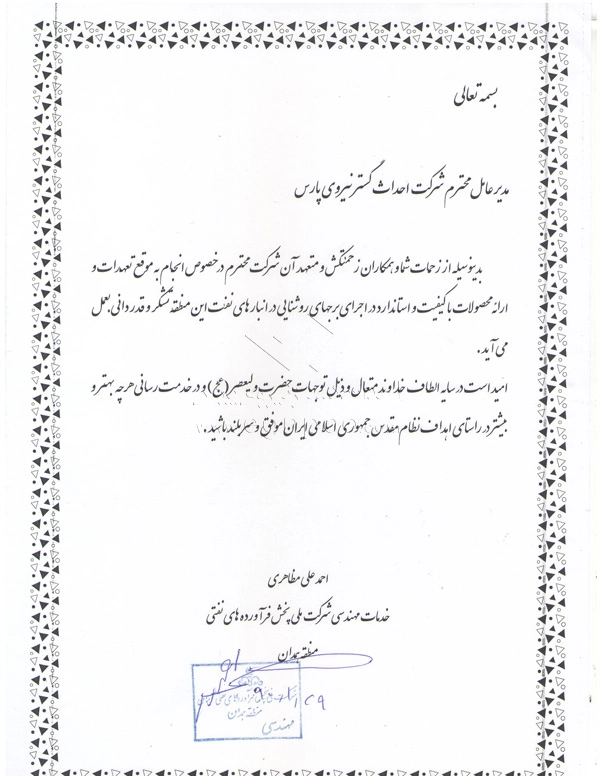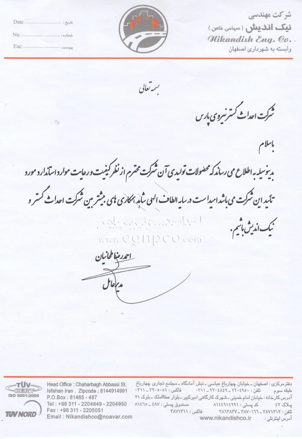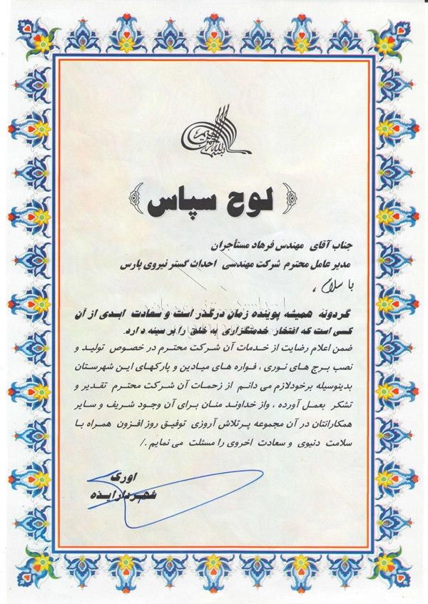 في عالم اليوم، من الضروري للتقدم والتطور إقامة علاقات متبادلة مع الشركات والمنظمات الأخرى وفي هذا الصدد، تمكنت شركة احداث بارس کستر من تقديم منتجاتها وخدماتها وفقًا لسياسة إدارتها المتمثلة في كسب ثقة العملاء و. الرضا (تصميم وإنشاء وتنفيذ قواعد إنارة الشوارع والمنتزهات وأبراج الإنارة (الإنارة) وصواري الملاعب وصواري الأعلام وقواعد المرور وغيرها من المنتجات) والحصول أخيرًا على دقة وجودة الموافقات التالية.