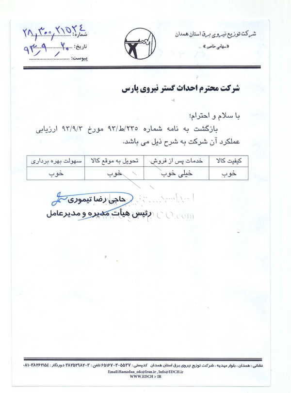 قائمة الشركات المصنعة لمعظم شركات توزيع الكهرباء (طهران الكبرى، أصفهان، خوزستان، مركزي، لورستان، قزوين، أردبيل، فارس، شيراز، همدان، شمال وجنوب كرمان، إلخ)